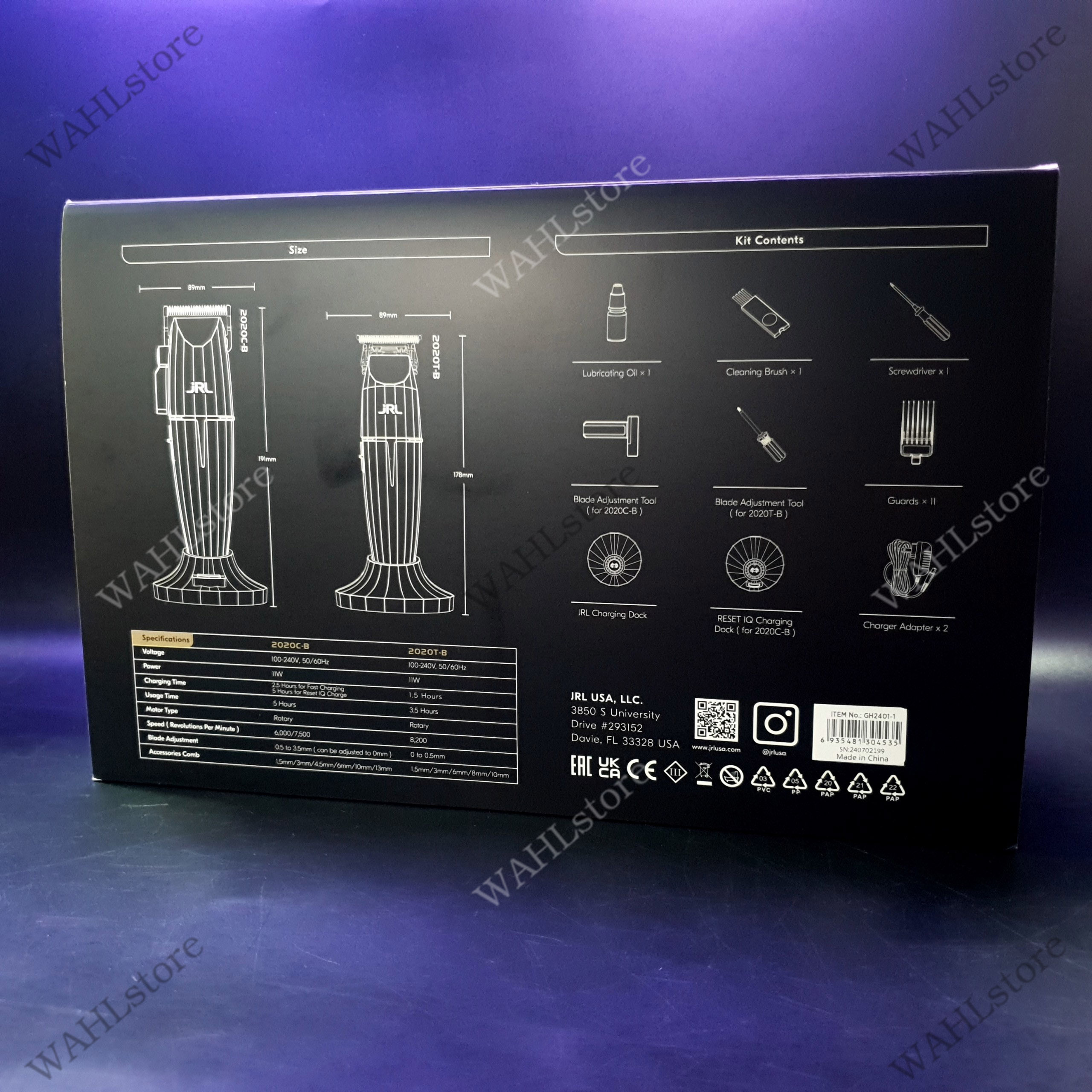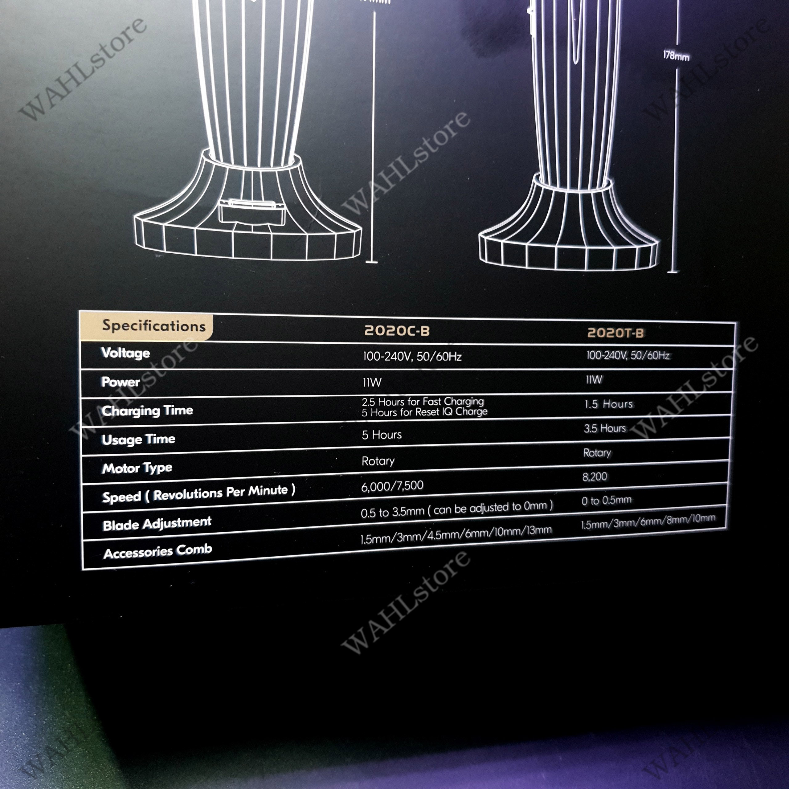 - Phụ kiện đi kèm: 6 cữ nhựa tông cắt (Độ dài 1.5mm/3mm/6mm/4.5mm/6mm/10mm/13mm), 5 cữ nhựa tông viền (Độ dài 1.5mm/3mm/6mm/8mm/10mm), 1 đế sạc tông cắt, 1 đế sạc tông viền, 2 cục sạc, 1 dây sạc USB, 2 tua vít, dầu tra, 1 chổi phủi, 1 thanh chỉnh lưỡi, nắp chụ bảo vệ lưỡi, sách hướng dẫn.