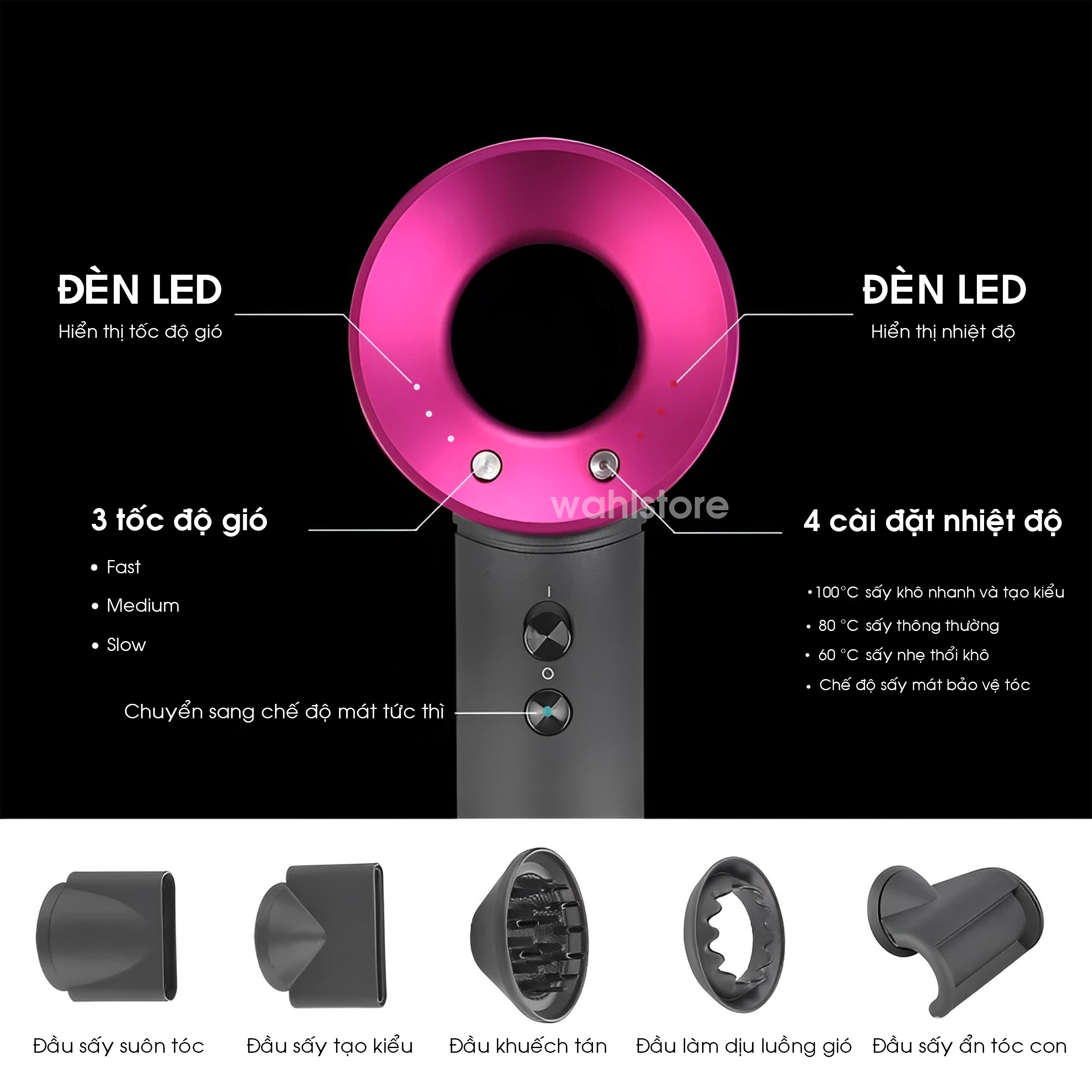 ⚡️3 mức nhiệt độ nóng: 60° (Sấy nhẹ thổi khô) - 80° (Sấy thông thường) - 100° (Sấy khô nhanh)