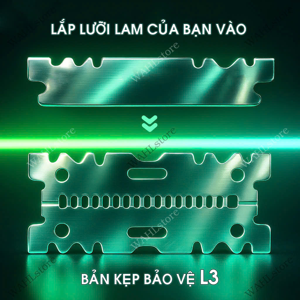 • Thiết kế ➝ Bản kẹp che bít tất cả phần sắc cạnh, che 2 mặt + 2 đầu của lưỡi lam (Đầu trên - đầu dưới) – Chỉ hở lộ các rãnh 1mm đủ để tóc và râu đi vào ➝ cạo an toàn 360 độ.